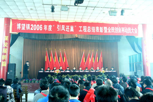 2007年2月26日上午9時,博望鎮(zhèn)2006年度“引鳳還巢”工程總結(jié)表彰和全民創(chuàng)業(yè)再動員大會在博望文體中心隆重舉行,當(dāng)涂縣縣長操隆山、縣委常委、博望鎮(zhèn)黨委書記張清、鎮(zhèn)長劉國寶等出席了大會并作了重要講話。會議對2006年度“引鳳還巢”和全民創(chuàng)業(yè)兩大工程中涌現(xiàn)出的各類先進(jìn)集體、先進(jìn)個人予以了表彰并對2007年的工作進(jìn)行了全部的部署。