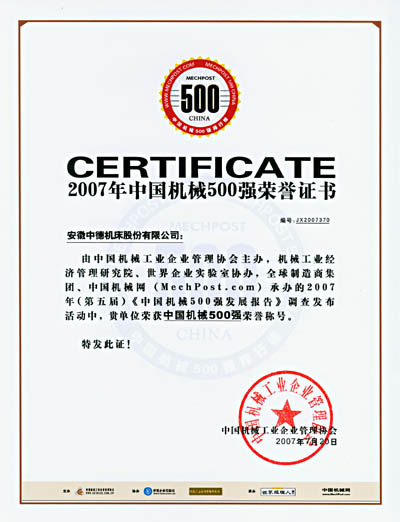中德公司入選2007年(第五屆)“中國機(jī)械500強(qiáng)”