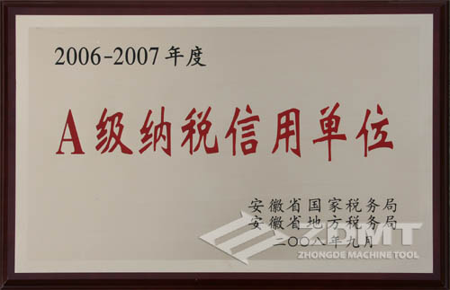 近日,安徽省國家稅務局、地方稅務局聯合表彰了2006-2007年度納稅信用等級A級納稅人,中德機床也再次被授予了“A級納稅信用單位”的證書。